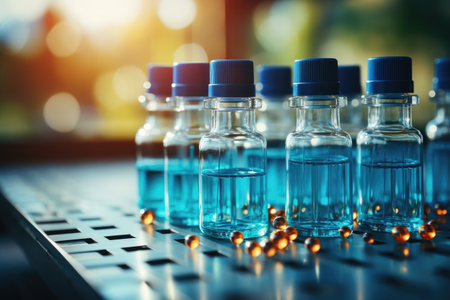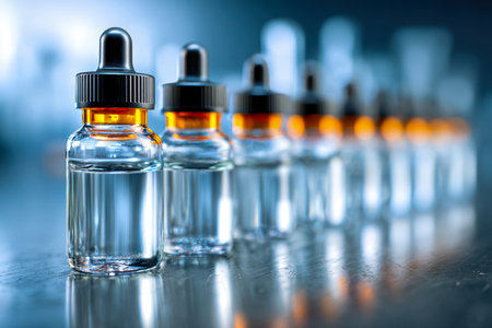Elegant glass vials with droppers, lined up on a glossy surface, their transparency highlighting the pristine liquid inside, set against a vibrant blue and warm orange gr