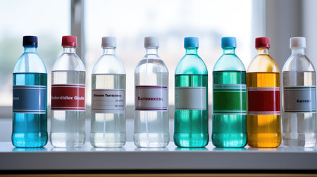 Set of empty plastic chemical bottles with straws in a lab environment Isopropyl isopropanol water other liquids 2019