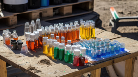A collection of vials containing vibrant liquids is displayed on a lab workbench during an experiment.