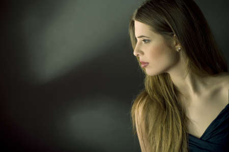sad gorgeous woman looks away thinking about something. Close-up portrait