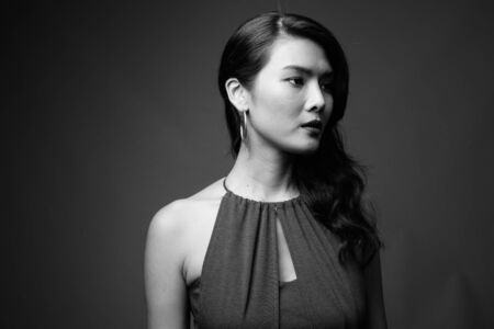 Portrait of a beautiful Asian woman in black dress standing in the dark