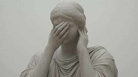 Statue of a woman covering her face with her hands on a white background