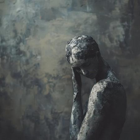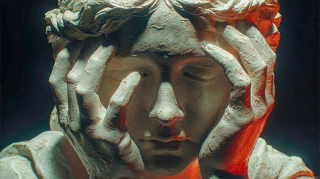 Artistic sculpture of a distressed figure holding its head, dramatically lit with moody shadows and red highlights/
