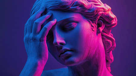 Digital Art of Cracked Classical Statue with Neon Pink and Blue Lighting