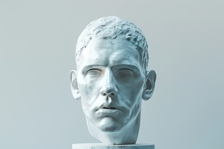 A man's head is shown in a white statue. The statue is of a man with a shaved head and a beard. The statue is made of white marble and is placed on a pedestal