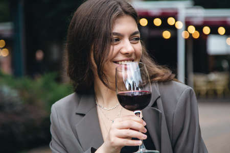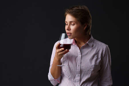 Portrait of italian sommelier drinking red wine from elegant glass standing at winery restaurant with bottle collection on backdrop. Attractive winemaker looking camera enjoying grape alcohol close up