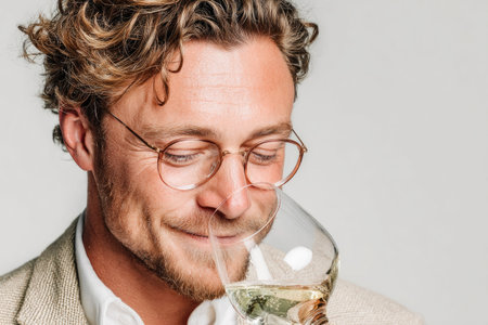 Male with curly hair, dressed in a blue shirt, is cheerfully holding a glass of white wine, set against a soft gray backdrop, conveying a festive atmosphere