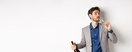 Celebration and holidays concept. Handsome bearded man in suit and birthday hat holding bottle, drinking glass of champagne, standing on white background