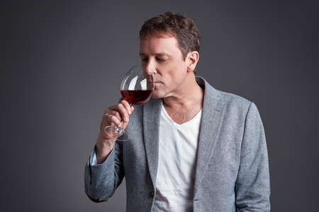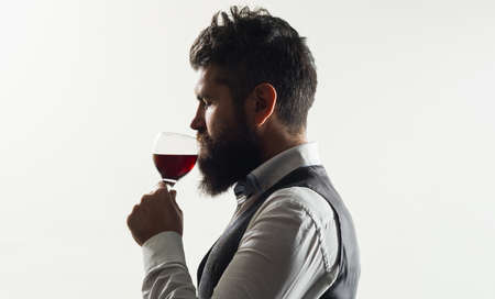 Sommelier smelling red wine in glass. Winemaker checking wine quality. bearded man with wineglass