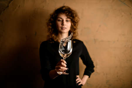Capturing refinement: sommelier showcasing a wine glass, the dark background accentuating the elegance of the moment, banner, copyspace