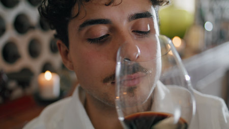 Close-up shot of a man savoring a glass of red wine, capturing the intimate and relaxed ambiance of the setting.