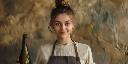 Portrait of a young female sommelier in an apron offering wine tasting. Concept Portrait Photography, Sommelier, Apron, Wine Tasting, Female Professional