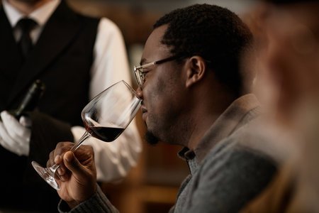 Black young adult man holding wine glass, smelling red wine during tasting session, sitting at table with server in background, participating in wine evaluation process