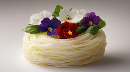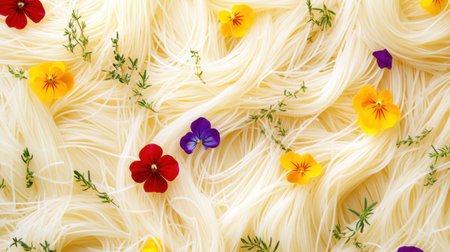 A beautifully arranged plate of gourmet glass noodles topped with fresh herbs and colorful garnishes, showcasing modern culinary artistry in dining.