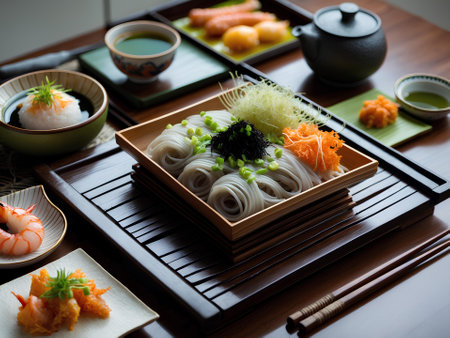 An artistic arrangement of fresh soba noodles, accompanied by dipping sauces and garnishes like scallions and wasabi, displayed on a rustic wooden board.