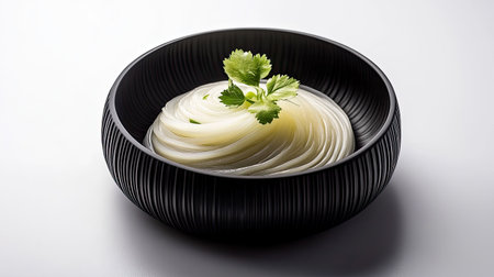A captivating presentation of rice noodles accompanied by a rich dipping sauce in a stunning gold bowl, enhancing the gourmet meal experience.