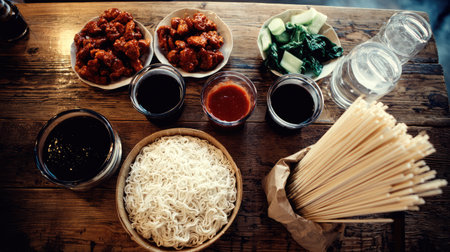 Enjoy a vibrant assortment of Asian cuisine featuring freshly prepared noodles, crispy chicken, flavorful sauces, and green vegetables on a rustic table.