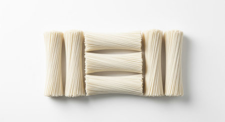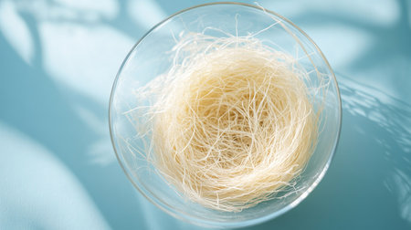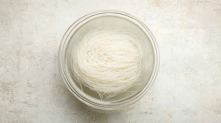 A clear bowl filled with fresh, uncooked rice noodles sits on a light textured background, ideal for Asian cuisine preparations and cooking projects.