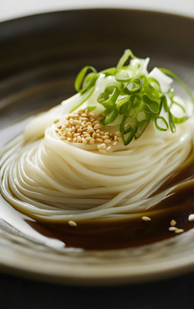Delicious plate of noodles topped with fresh green onions and sesame seeds, ideal for culinary photography and food presentation.