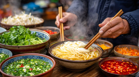 A captivating composition featuring bowls of noodles with steam rising, wooden chopsticks nearby, creating an inviting atmosphere for culinary enthusiasts.
