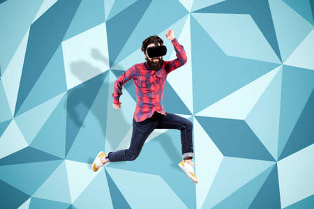full length portrait of young bearded hipster man in virtual reality glasses, jumping over colored background