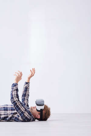 Man lying on floor, enjoying virtual reality glasses
