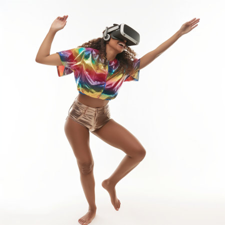 Young woman dancing and having fun while wearing VR headset on white background.