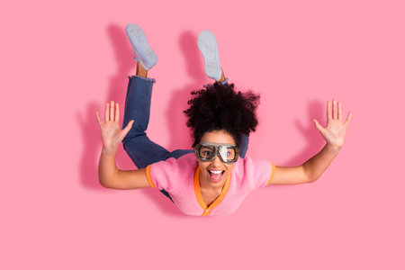 Cheerful girl with curly hair posing in a vibrant pink background, wearing goggles and casual attire with a playful gesture