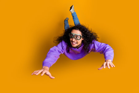 Young man in a flying pose with goggles, wearing a purple hoodie over a yellow background, exuding energy