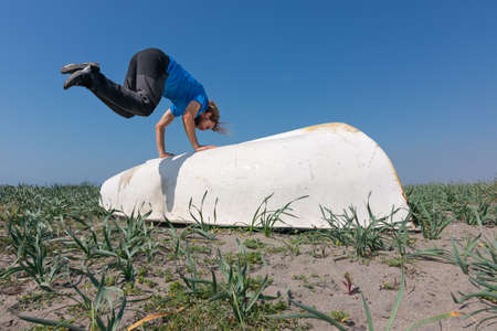 A man is doing stunts on a white boat on the sand. There are plants in the sand. The sky is clear and blue.