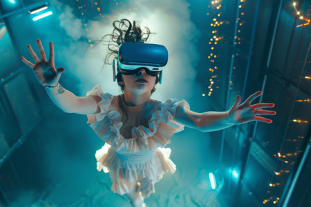 Futuristic technology concept. Young woman wearing virtual reality glasses and floating during a VR immersive simulation while trying to touch a modern light