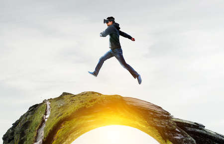 Virtual reality games. A modern teenage boy flies through the air wearing virtual reality glasses, immersing himself in the game. Sky blue background with a glowing energy field. Copy space.