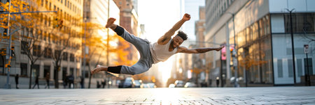 Young man dancing breakdance in the city at sunset. Panorama
