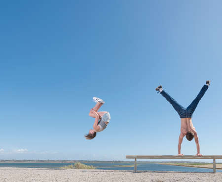 Girl doing somersault, boy doing handstand on beach bench