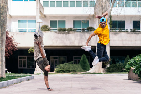 Two multi-ethnic friends dancing in the park and doing break dance moves.