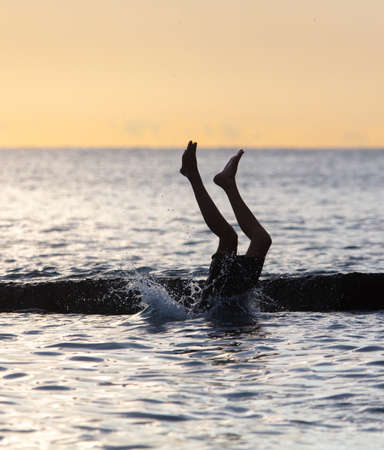 Boy swims in the sea with splashes at sunset.