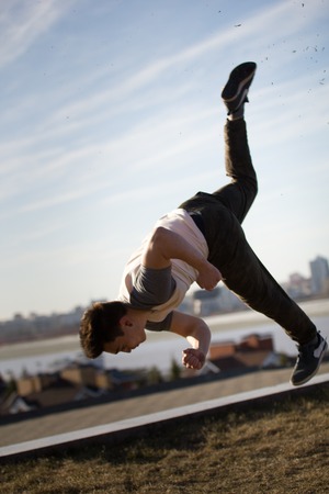 young parkour man doing flip or somersault