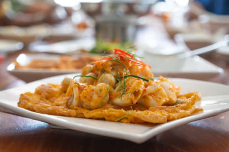 Creamy omelette with shrimp on rice on wooden table