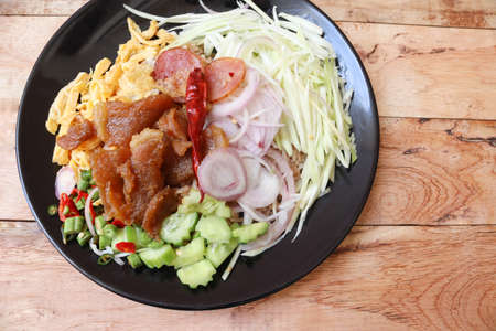 Thai food - Kao Cluk Ka Pi Mixed Cooked Rice with Shrimp Paste Sauce on white round dish
