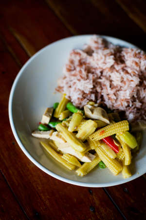 Fresh prepared asian spicy tofu baby corn thai stirfry served with red jasmine rice. Traditional thai cuisine made of fresh ingredients.