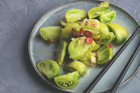 Spicy green tomato and garlic salad on ceramic plate with chopsticks