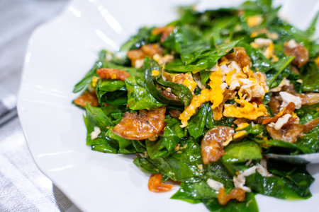 stir fried malindjo leaves with egg and dry shrimp,Thai food