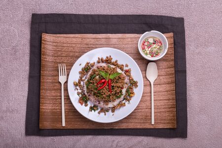 Stir Fried Spicy Minced Pork with Herbs served with Vegetables. Classic Thai cuisine.