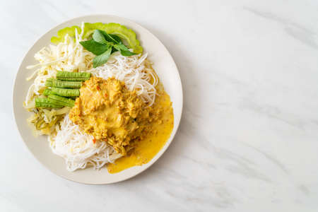 Thai Rice Noodles with Crab Curry and Variety Vegetables - Thai local southern food