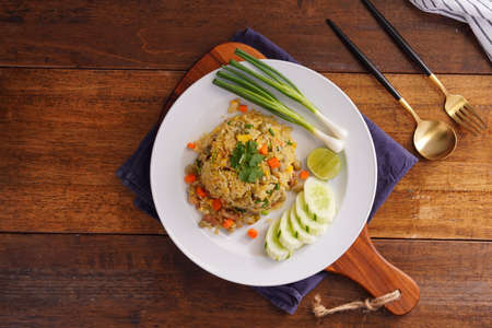Top view Fried rice with shrimp paste (Khao Khluk Kapi) is Thai street food.