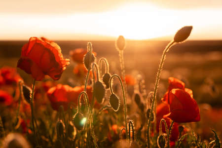 Beautiful flowers red poppies blossom, wild field at sunset, selective focus, soft light, light of setting sun, Close-up of scarlet vivid poppy on green fleecy stems, sunny summer day, Czech Republic