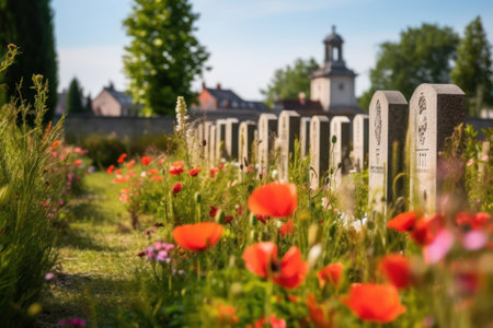 Old cemetery with red poppies in the foreground, generative ai