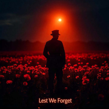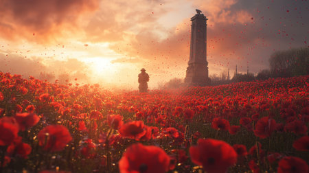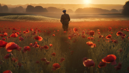 Silhouette of a soldier standing in a field of red poppies at sunrise, symbolic Remembrance Day tribute.