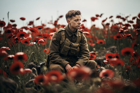 A reflective soldier sitting in a poppy field, paying tribute to those who died in war, surrounded by the poignant beauty of the flowers