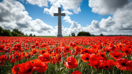 A sea of crimson blooms gently sways beneath somber wooden markers, evoking remembrance and tribute to fallen heroes in a tranquil, heartfelt setting.
